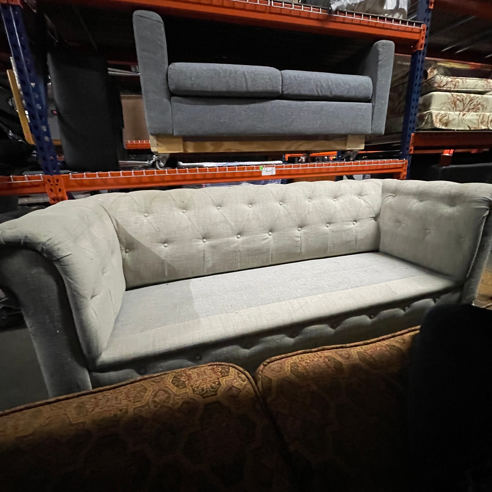 Two Light Gray Couches/ One has no cushion/There are two additional sofa covers-one dark gray, the other brown&white striped- with matching ...